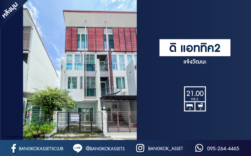 ขาย - ทาวน์โฮม 3 ชั้น ใจกลางเมืองมือสอง โครงการ พลัสซิตี้พาร์ค งามวงศ์วาน25 เนื้อที่กว้าง 21.30 ตร.ว. ฟังก์ชัน 3 ห้องนอน 3 ห้องน้ำ 2 ที่จอดรถ แถมฟรี! เครื่องปรับอากาศ, เครื่องทำน้ำอุ่น, เครื่องดูควัน, ปั๊มน้ำ, เตาไฟฟ้า โครงการตั้งบนทำเลเดินทางสะดวก เชื่อมต่อถนนงามวงศ์วาน ใกล้รถไฟฟ้าสายสีม่วง "สถานีศูนย์ราชการนนทบุรี" และจุดขึ้นทางด่วน "งามวงศ์วาน"
